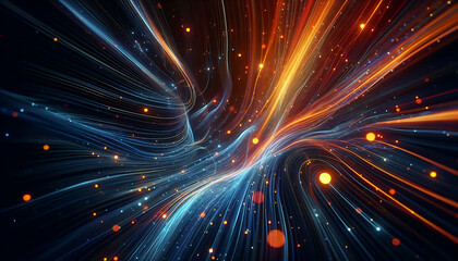 Abstract dynamic flowing lines in vibrant orange blue hues composition evokes a feeling of motion and light suggesting a digital or futuristic theme against a dark background