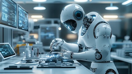 A futuristic robot repairing a broken machine in a high-tech workshop, surrounded by tools and equipment.