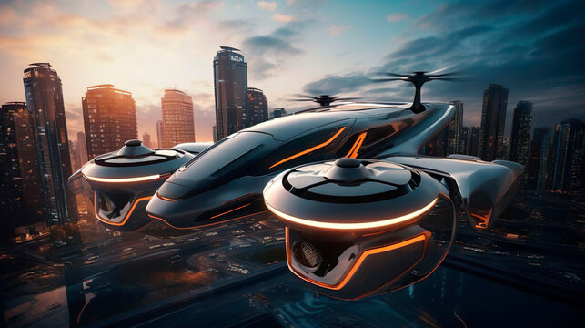 Futuristic public transport next to green space. Modern city tram on the background of the evening metropolis. Generative AI