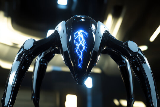 A futuristic AI core with pulsating blue veins of energy, sleek metallic reflections, and a deep, ominous glow.