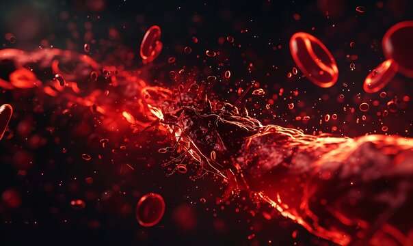 A dynamic wave of 3D-rendered red blood cells flowing through an abstract, dark background, highlighting the movement and vitality within veins and arteries