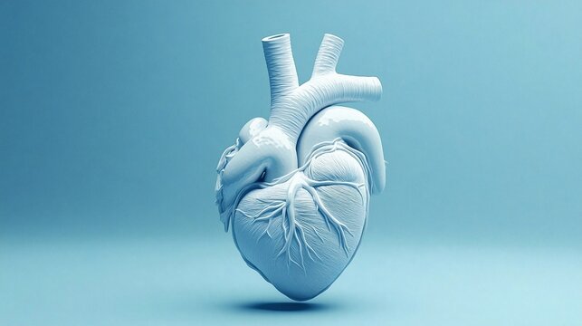A lifelike digital rendering of a human heart in glossy white tones, set against a light blue gradient, with detailed veins and arteries.