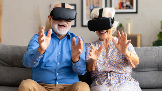Elderly couple enjoying virtual reality experience at home, using virtual reality helmets. elderly people using modern technologies. technology lifestyle promotion, active aging, modern elderly