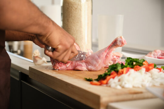 Unrecognizable young black man de-boning chicken to prepare a recipe in a kitchen.