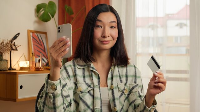 Happy Asian Korean woman holding credit card mobile phone smartphone female smiling businesswoman home indoors online payment shopping discounts client customer lady app Chinese Japanese girl business