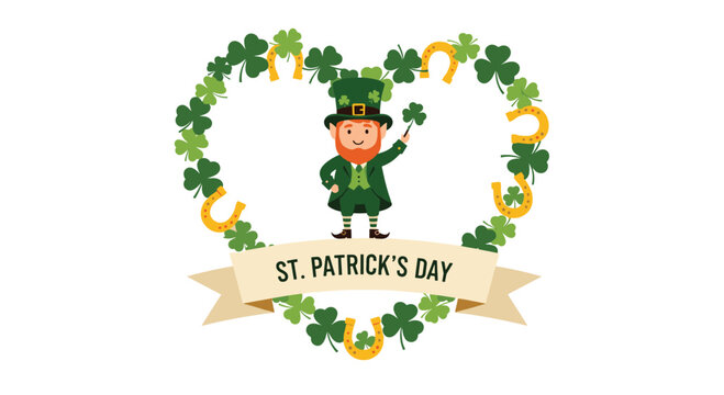 Leprechaun character standing in a heart shaped frame of clovers and golden horseshoes for St Patricks Day celebration.