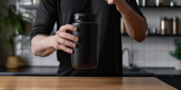 Male bodybuilder stands in the kitchen and holding a jar of protein powder or gainer in his hand.