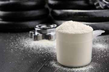 Measuring scoop of protein powder and weight plates on grey table, closeup