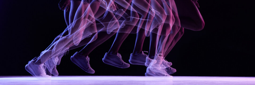 Runner step progression with purple neon motion layering. Concept of step-cycle study, gait analysis, biomechanics research, and high-tech sports performance visuals with dynamic movement emotion.