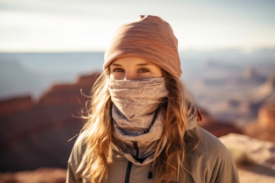 Medium shot portrait photography of a grinning girl in her 20s wearing a protective neck gaiter at the grand canyon in arizona usa. With generative AI technology