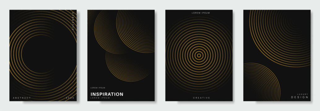 Three black and gold invitation templates for a gala dinner on June 14, 2025. Elegant designs with wave and circle patterns.