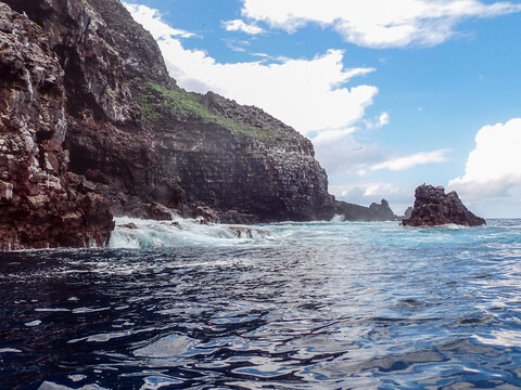 Rock in the ocean on a background of the cloudy sky, Galapagos Island, Isla Isabela.