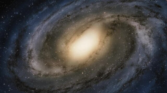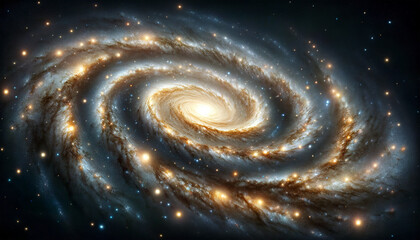 Stylized illustration of a spiral galaxy with swirling arms and a bright central core against a dark starry sky