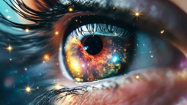 Close-up of an eye with glowing particles inside the iris. Looks like galaxy or data connections reflecting in eye. Surreal vision of artificial intelligence.