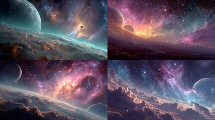 Explore vibrant cosmic wonders with sprawling nebulae and distant planets, creating a sense of awe and inspiration for space exploration and discovery