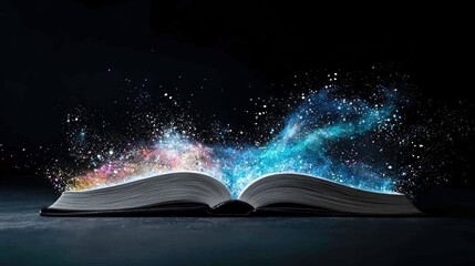 An open book with glowing magical energy bursting out of its pages against a dark background.