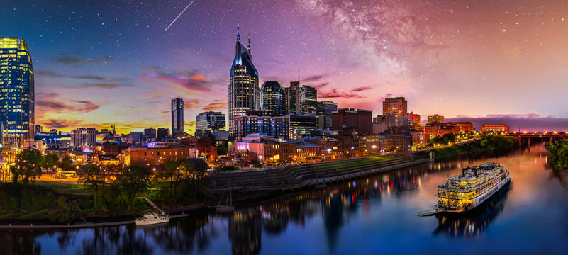 Nashville Downtown Skyline, Time Lapse by Night with Stars and Milky Way in Background, Tennessee, USA