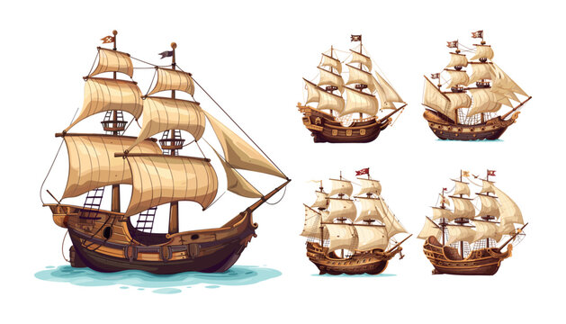 Pirate ships cartoon vector set. Sailing marine galleon caravel corvette combat medieval ocean transport sea hunters robbers bandits, highlighted illustrations on white background