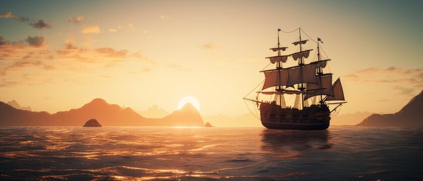 Pirate ship sailing on the open sea, with the wind in its sails and the sun setting in the background. Generative AI