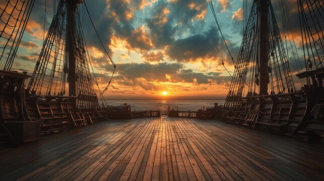Wooden ship deck at sunset, ocean view. Perfect for adventure, travel, and nautical themes, evokes feelings of freedom and exploration.