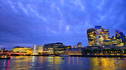 London skyline at dusk from Hays Galleria near London Bridge, London, England, United Kingdom, Europe