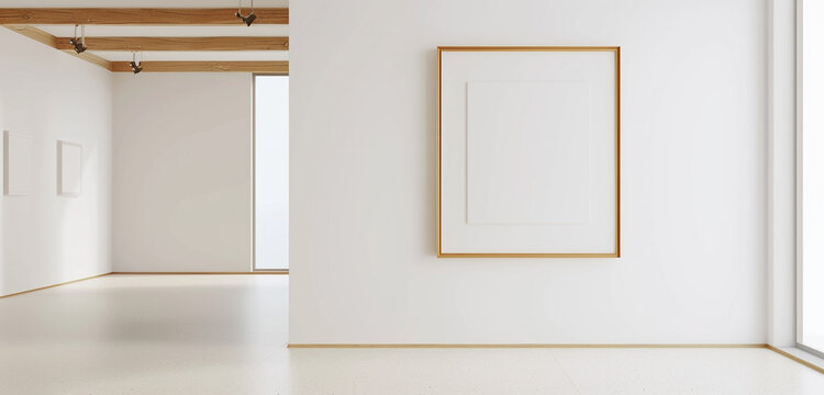 Captivating and surreal floating empty frame in a minimalist art gallery, extended format.