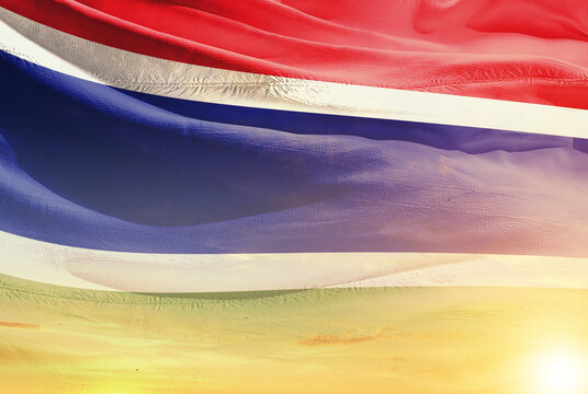 The Gambia national flag waving in sunny sky with beautiful sunset. The Gambia national flag for independence day.