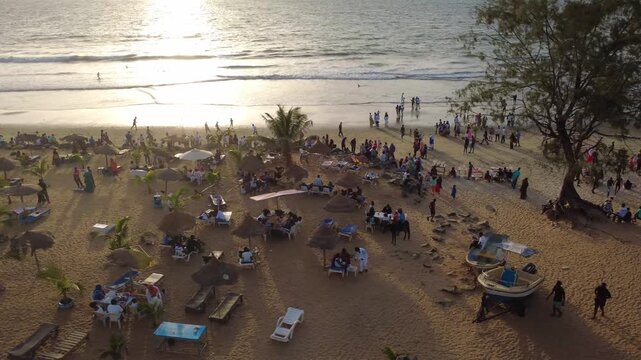 THE GAMBIA - 10.31.2025 - Terrific aerial footage moving along the coastline of the Gambia's Senegambia Beach at sunset.