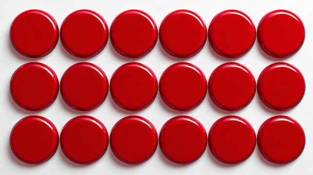 An array of eighteen glossy, red checkers arranged in a grid, ready for play