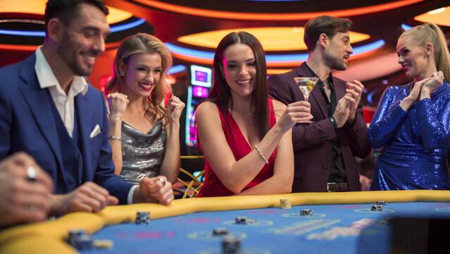 Group of Diverse Young People Gambling at the Baccarat Table in Casino. Glamorous Guests Placing Cool Bets while Playing Baccarat. Crowd Celebrating a Big Wins, Cheering the Winner