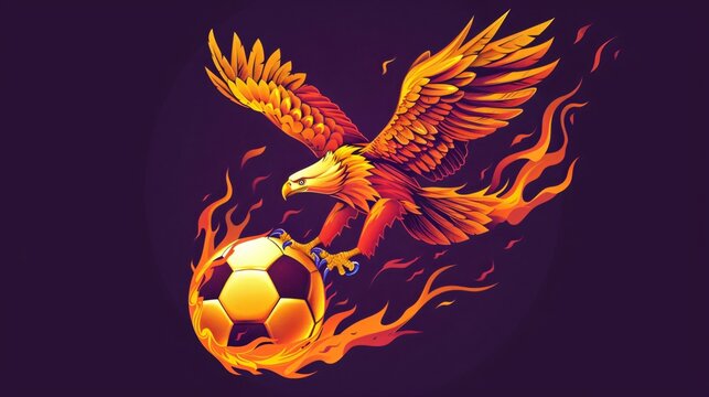 Fiery eagle grasping flaming soccer ball. Sports betting concept for World Cup, Super Bowl. Dynamic mascot design for team logo or gambling advertisement