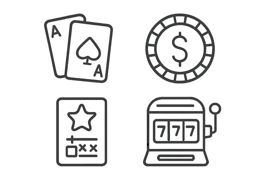 Casino and gambling linear icons set. Editable stroke. Thin line illustrations. Slot machine jackpot, poker aces, dollar coin chip, and lottery scratch card. Vector pack.
