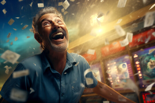 a man celebrating a success or win, or a cash prize, lotto gambling win of big money achievement at the casino