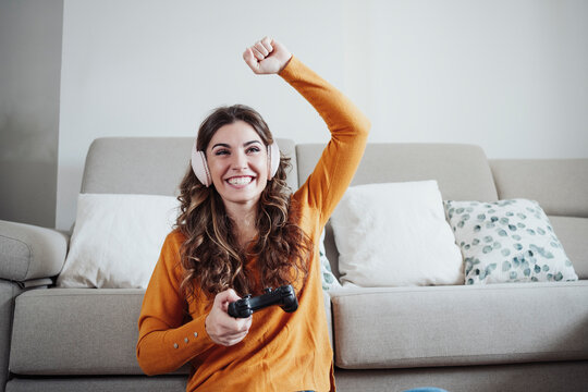 Happy gamer winning tournament in video game while sitting in dark gaming room.