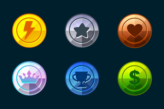Set of game metal icons-energy, star, heart, dollar, crown and award cup