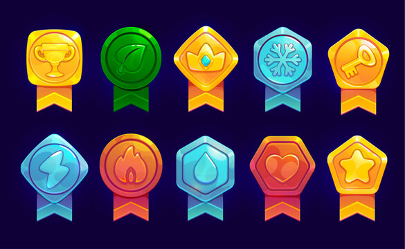 Game achievement medal badge, level rank. Vector set of colorful trophy icons, asset ribbons in vibrant colors with symbols for recognizing accomplishments in gaming and enhancing user experience