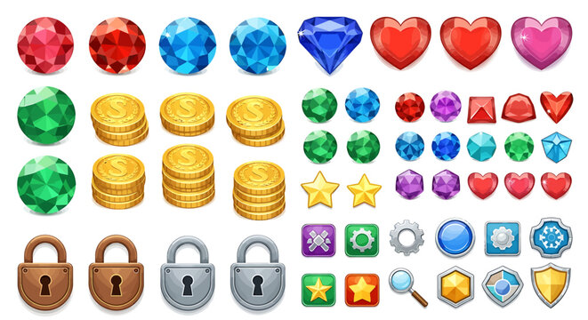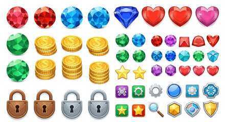 Vector illustration set of glossy game icons including precious jewels, treasure coins, medieval locks, and fantasy UI elements for app development