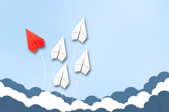 Red paper plane flying in a different direction than the white ones. Cloudy sky. Copy space. The concept of innovative solutions, creativity. Business. Lifestyle.