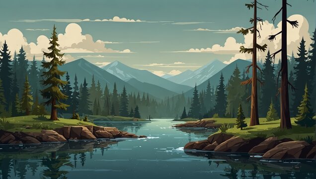 Forest river landscape, never ending serene background with separated layers for game design. 2d style