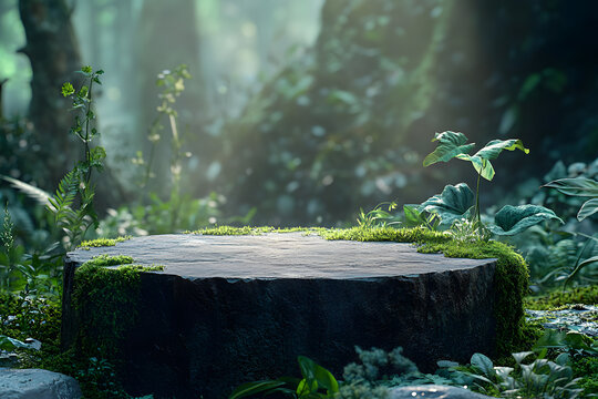 Stone podium at magic forest, plants, green moss, herbs, dew - 3D mockup background beauty product presentation concept. Copy space platform for Cosmetics, perfume fashion sales advertising stand.