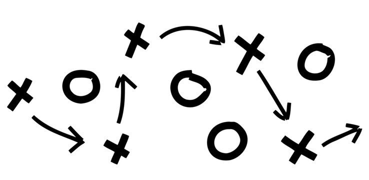 Sports tactics and strategy. Scheme of movement of team player. Combination of crosses and circles with path arrows. Pitch ball instructions.