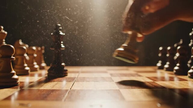 Hands strategically moving chess pieces on wooden board. Close-up cinematic slow-motion sequence of thoughtful gameplay and tactical decisions in chess match.