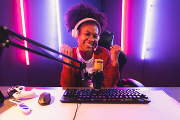 Selfie, influencer and woman with live streaming update in neon bedroom with social media audience, fans or followers. Excited content creator, gamer or streamer by mic, smartphone and gaming at home