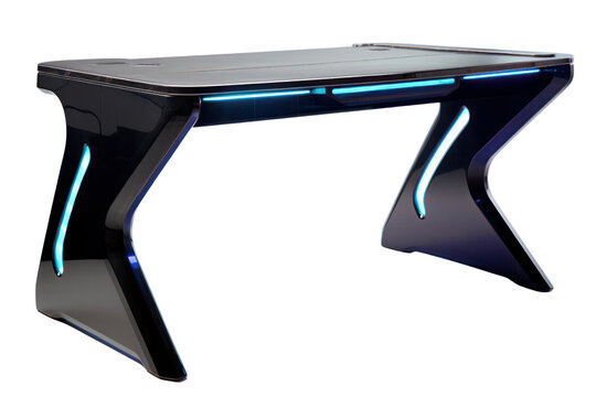 gaming desk with integrated LED lights and ergonomic features, isolated on a white background.