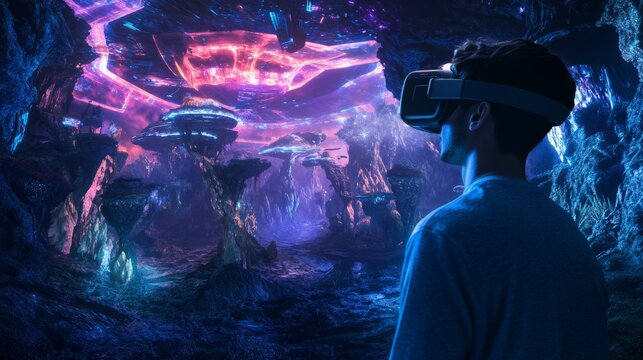 A gamer immersed in a virtual reality world with futuristic landscapes and digital avatars, Virtual gaming scene, Enthralling style