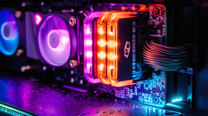 RGB Gaming PC Build Close-up: A captivating close-up shot of a high-performance gaming PC, featuring vibrant RGB lighting on the motherboard and cooling system.