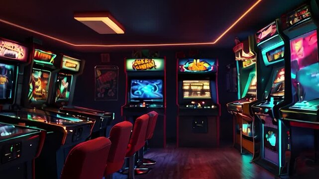 Retro Arcade Game Room with Neon Lights and Classic Cabinets