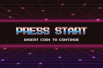 Pixel art night game background with grass, sky and you won game 8-bit text. Game screen pixel
