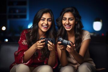 Indian lesbian women couple enjoying in playing games together while sitting on sofa late night at home. Happy lgbt couple having fun with games, using game controllers.