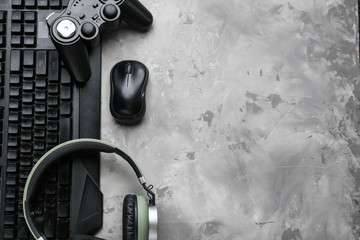 gamer workspace concept, top view a gaming gear, mouse, keyboard, joystick, headset, mobile joystick, in ear headphone and mouse pad on black table background.